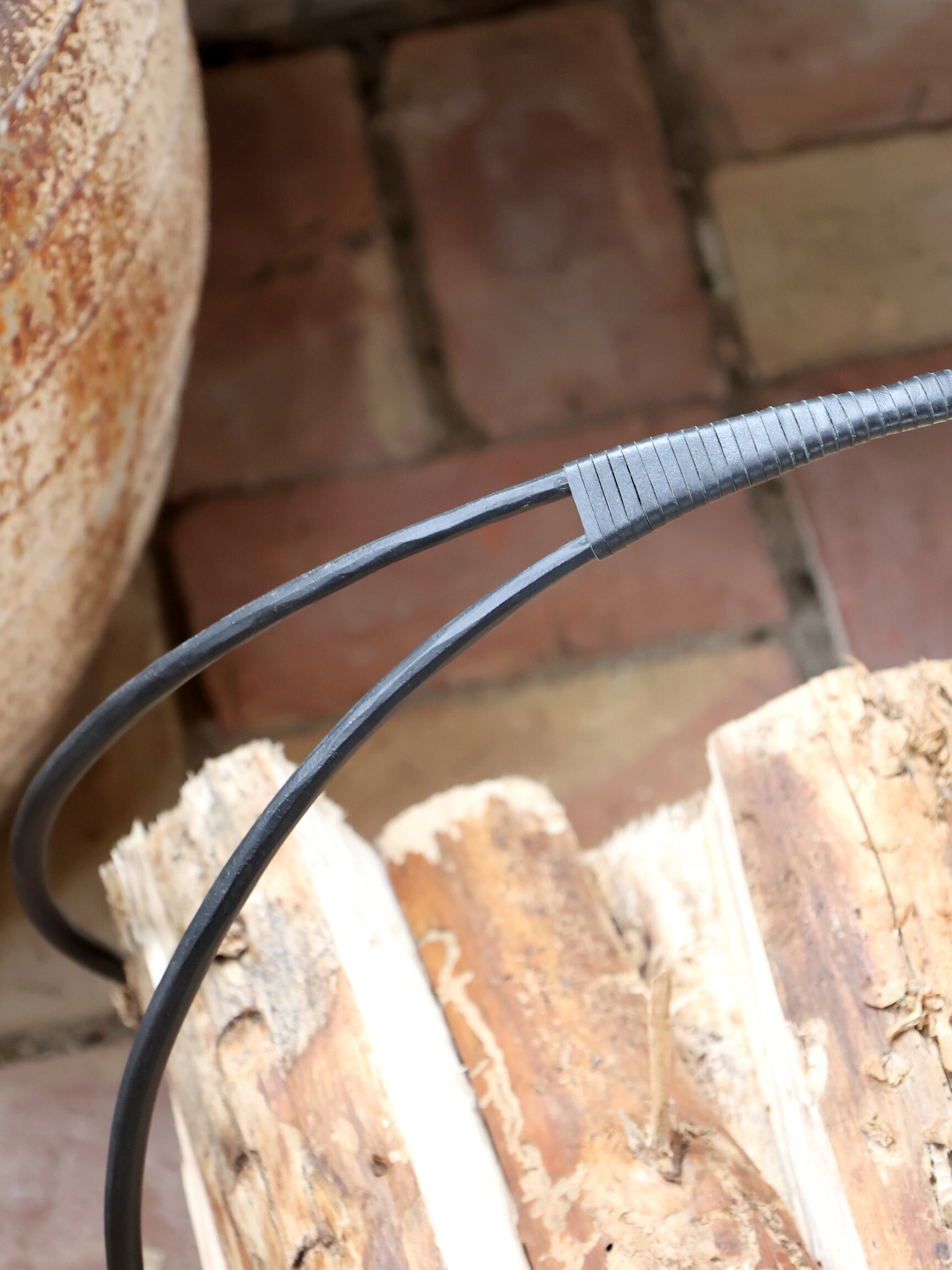 Bilden visar en närbild på ett förvaringsställ från Chic Antique, kallat Förvaringsställ Antiksvart, tillgängligt hos LyxigaPlåtburkar.se, en butik specialiserad på exklusiva plåtburkar och noga utvalda förvaringslösningar. Fokus ligger på stålets form och konstruktion, där två svarta metallstänger löper parallellt och är omsorgsfullt lindade med metalltråd, vilket skapar en robust och hållbar sammansättning. Den mörka metallen har en matt yta och en något rå struktur, vilket bidrar till att lyfta fram de industriella inslagen i designen.