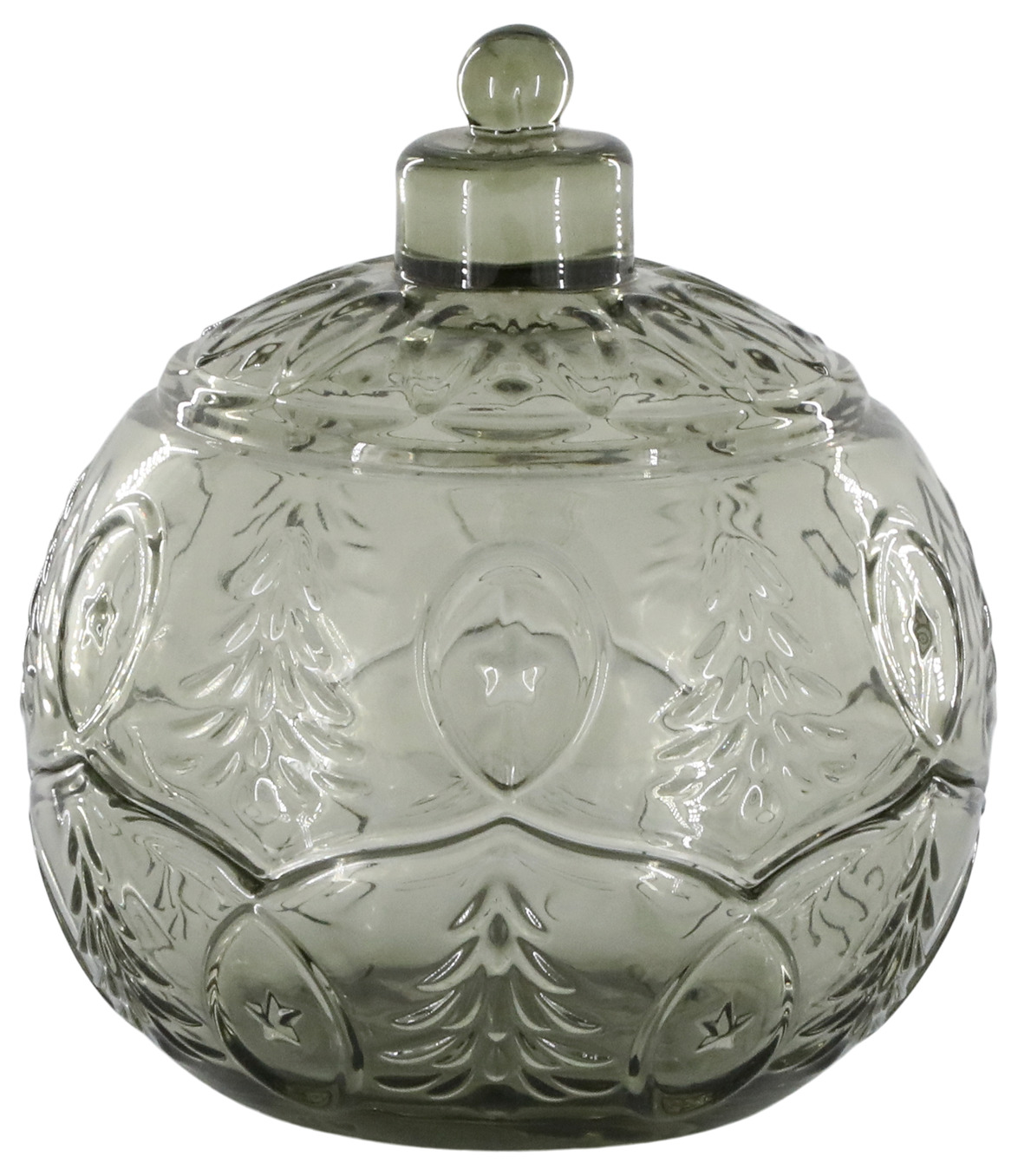Charmig glasburk i olivfärgat glas med vackra mönster av julgranar och stjärnor. Perfekt till julgodis eller nötter – och lika fin som dekor på bordet. Burken har ett matchande lock som gör att innehållet hålls fräscht samtidigt som den blir ett elegant blickfång.