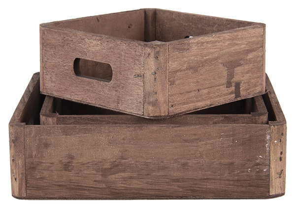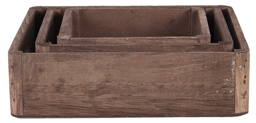 Rustika trälådor i set om tre som passar perfekt för både förvaring och dekoration. Den naturliga träytan och den enkla designen ger en varm och tidlös känsla som passar fint i många olika miljöer.