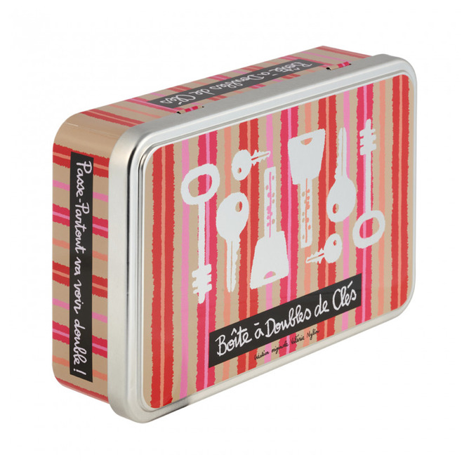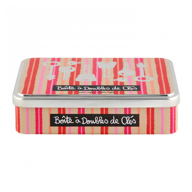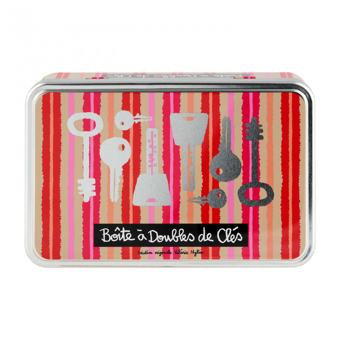 En dekorativ och praktisk plåtburk för förvaring av nycklar. Burken har ett färgstarkt randigt motiv med stiliserade nycklar som ger ett lekfullt och charmigt intryck. Perfekt för att samla reservnycklar, extranycklar eller andra små saker på ett snyggt och organiserat sätt.