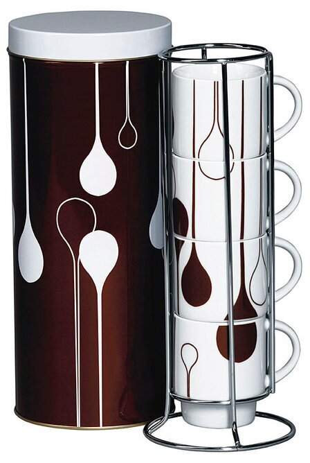 Bredvid burken står de fyra eleganta muggarna i en metallupphängning som håller dem snyggt organiserade. Muggarna är dominanta i vitt med identiska bruna skedmotiv, vilket speglar plåtburkens mönster och skapar en harmonisk matchning. Med sin avlånga, cylindriska form staplas de i ett vertikalt rör, vilket sparar plats och ger ett rent, minimalistiskt uttryck.