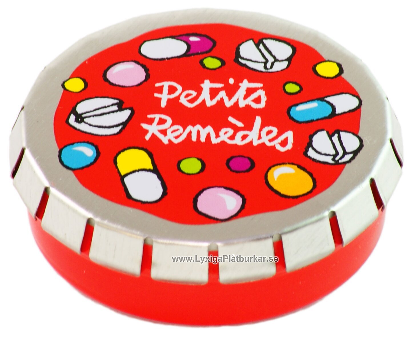 Ytan på burkens lock är i en livfull röd färg, dekorerad med olika illustrationer av tabletter och piller i olika former och färger, vilket ger ett lekfullt intryck. I centrum av locket finns texten "Petits Remèdes" i vitt, skrivet med en avslappnad handstil. Omkretsen av burken är prydd med en silverfärgad kant som har små indrag. Denna detalj ger burken en unik och distinkt detalj, vilket gör den lätt att känna igen.