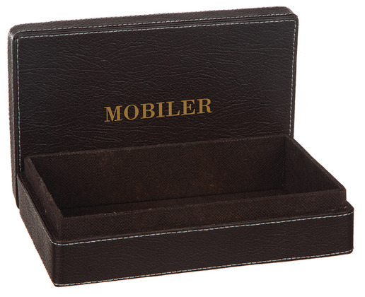 Lådan är tillverkad av ett material som ger intrycket av konstläder, vilket framhävs av en tydlig struktur på ytan. Det mörka bruna konstlädret har en präglad textur som påminner om läder, med märkbara linjer och mönster som ger ett hantverksmässigt uttryck. Locket är rektangulärt och är fäst på baksidan av underdelen så att det kan stå öppet. Det är något högre än själva lådan och har rak, skarp kant runtom, vilket ger en strikt och distinkt kontur. Insidan av locket är slät, och mitt på syns ordet MOBILER tryckt i guldiga bokstäver, vilket skapar en tydlig kontrast mot det mörka materialet och bidrar till en praktisk märkning.
