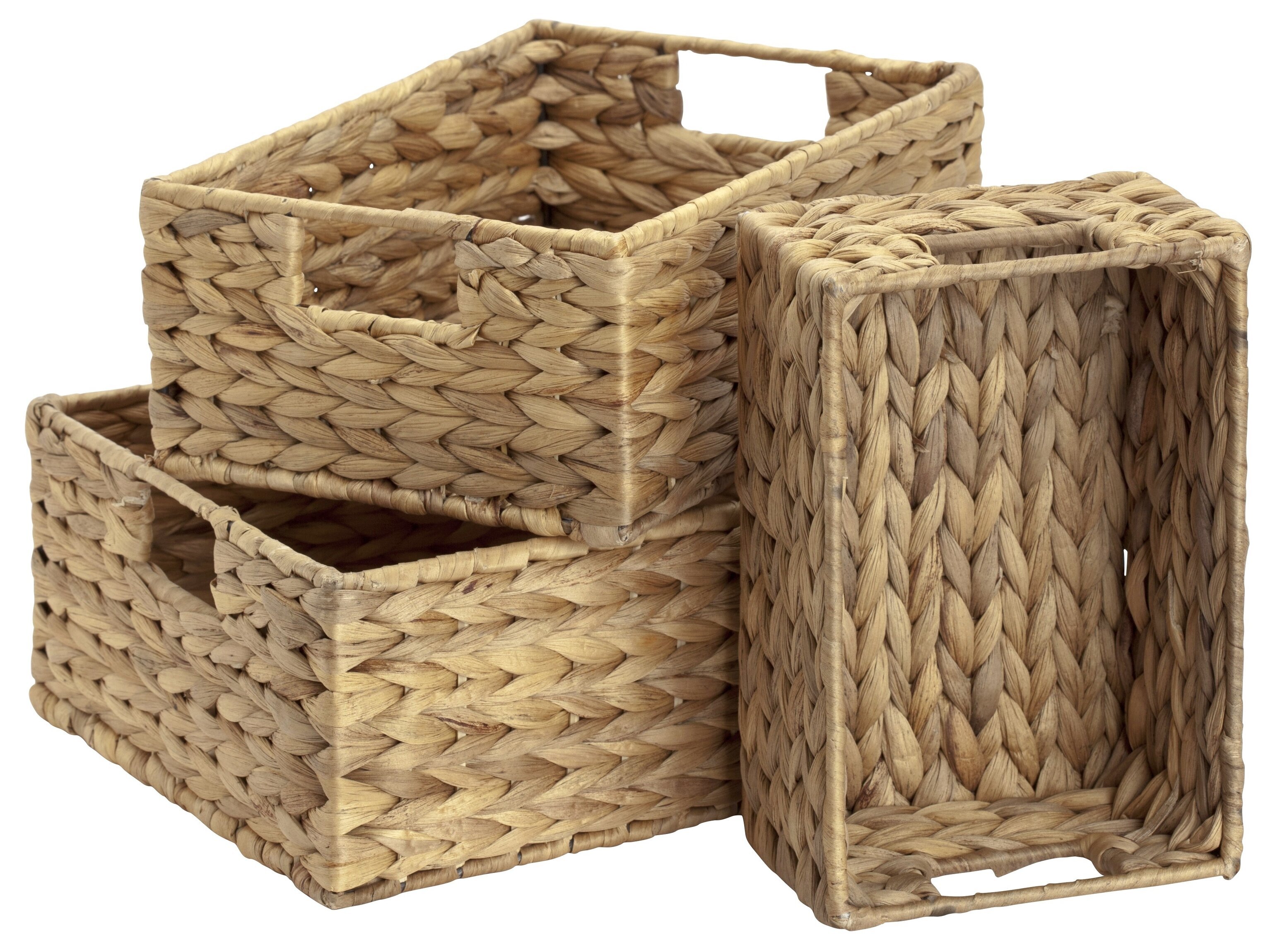 Korgarna är vävda i ett naturligt material, vilket ger dem en jordnära och organisk känsla. Materialets naturliga nyanser sträcker sig från ljust beige till olika toner av brunt. Det flätade mönstret har en diagonal riktning som löper genom korgarnas sidor, vilket ger ett strukturerat intryck. Varje korg har en rektangulär form med öppet lock och förstärkta kanter, vilket bidrar till deras stabilitet.