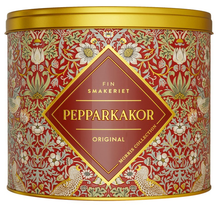 Ångbakade pepparkakor förpackade i en vacker plåtburk med mönster Strawberry Thief från William Morris. Läs mer
