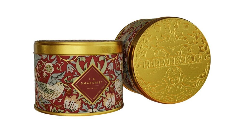 Ångbakade pepparkakor förpackade i en vacker plåtburk med mönster Strawberry Thief från William Morris. Läs mer