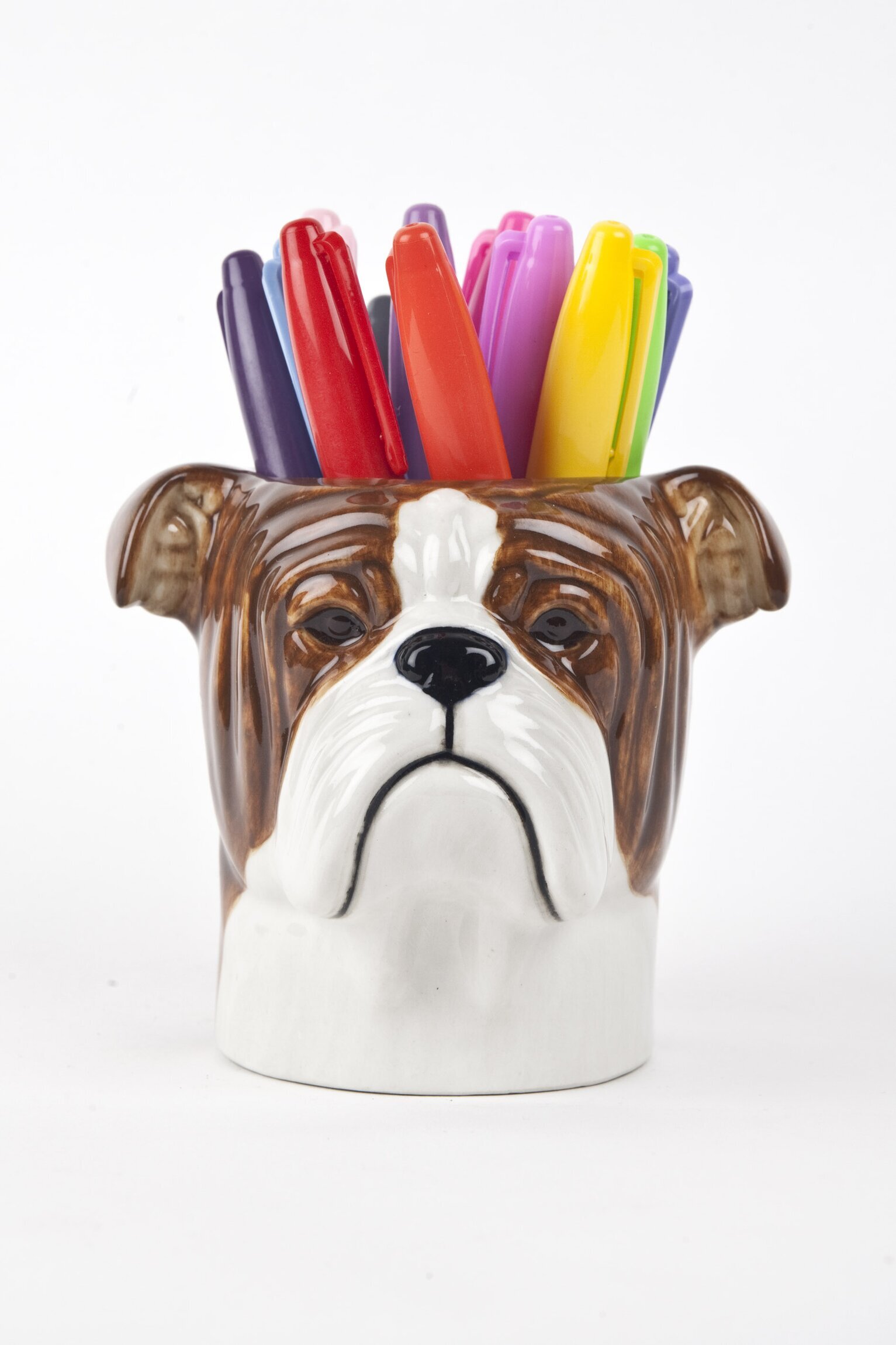 På bilden syns hela burkens höjd, från dess rundade botten till örontopparna och vidare upp till pennornas spetsar. Bakgrunden är helt ren och ljus, vilket gör att ljuset faller jämnt över motivet och framhäver såväl form som glans. Om man tittar noggrant ser man subtila reflektioner i den glaserade ytan, särskilt kring bulldogshuvudets panna och nos, där ljuset fångas in.