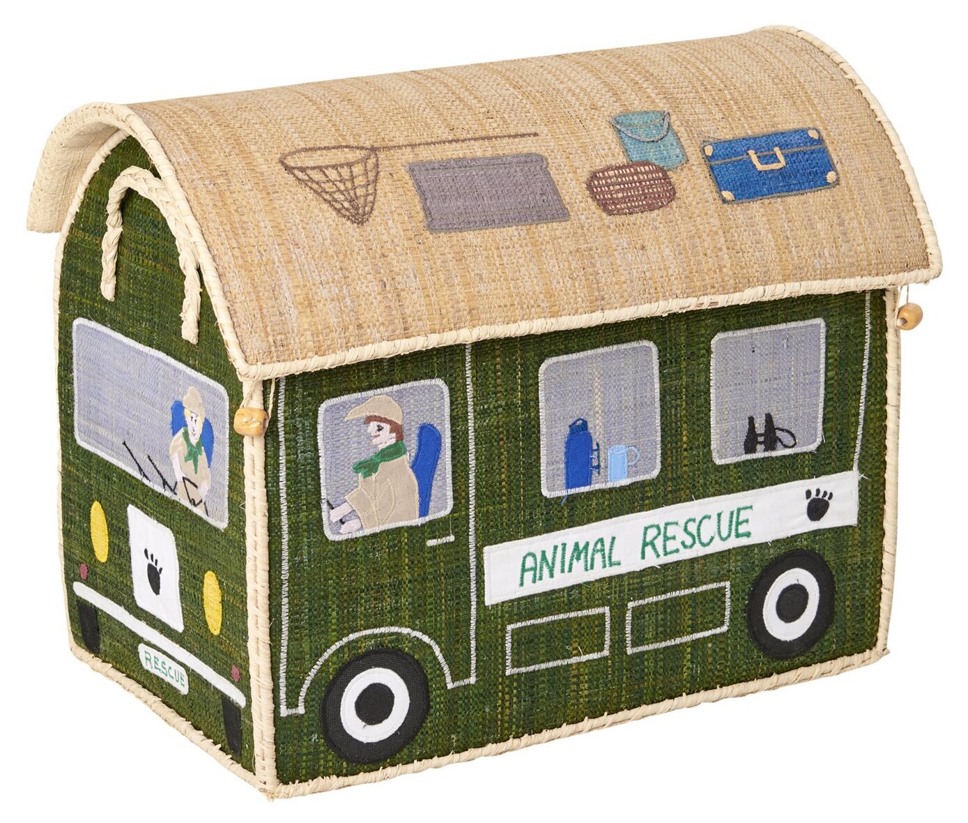 Bilden visar en förvaringskorg från Rice som ingår i sortimentet hos LyxigaPlåtburkar.se. Korgen, benämnd Förvaringskorg Animal Rescue Medium, är utformad som en liten skåpbil med en distinkt visuell stil. Korgen har en grön basfärg med detaljer i flera nyanser. Den är skapad för att likna en räddningsbil med texten "Animal Rescue" framträdande på sidan.
