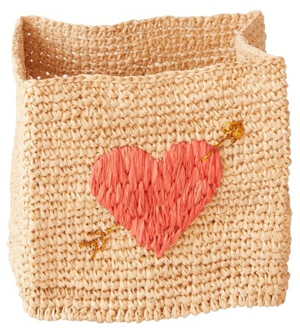 Korgens kvadratiska form gör den praktisk för förvaring och den robusta konstruktionen tyder på att den är skapad för hållbarhet och långvarig användning. Den naturliga nyansen av det flätade materialet kontrasterar mjukt mot det korallfärgade hjärtat, och tillsammans bidrar dessa färger till ett neutralt och varmt intryck.