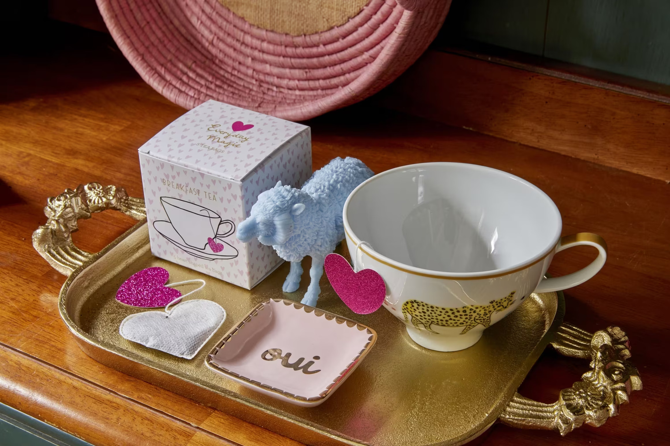 Bredvid smyckesfatet finner vi en stor vit kopp, prydd med en illustration av en leopard. Den kontrasterar elegant mot koppens rena, vita yta. En rosa hjärtformad prydnad i glittrande finish hänger över koppens kant och bidrar med ett stänk färg och textur.