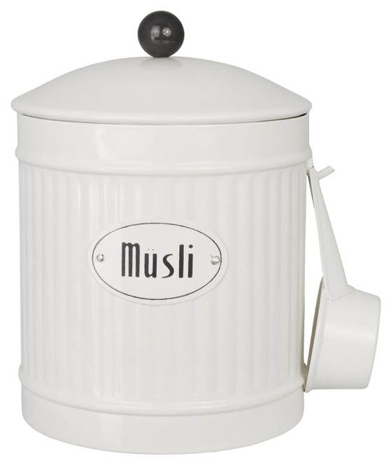 Stilren och praktisk plåtburk för förvaring av müsli, flingor eller andra torra livsmedel. Burken har en klassisk vit design med dekorativ etikett på framsidan och ett matchande mått som gör serveringen enkel.
